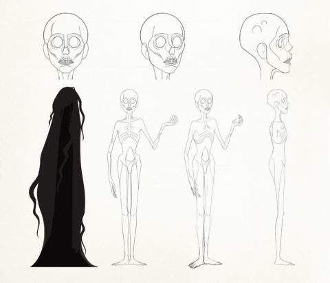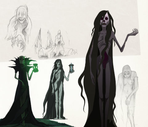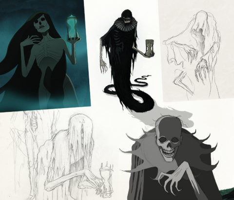 To spice the story, I added the Father: absent in the original tale, he becomes a first antagonist—mischievous and extravagant, a nod to the Château des Ombres. His grotesque humor contrasts sharply with the ensuing tragedy. The twisted vineyard vines guided my design: I wanted the gnarled stalks reflected in the Winemaker’s twisted hair—but I abandoned that idea for Mathilde to preserve the natural elegance of her hair in the wind. Rather than age them through bitterness or drunkenness, I chose a gentler evolution: their love ultimately frees Death. My inspirations spread between Paul Grimault’s poetry, Hayao Miyazaki’s world, and the sheer delight of unexpected TV‑reference Easter eggs.