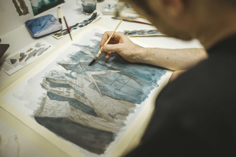 Gradually, I shaped this imaginary medieval Swiss world: faces, costumes, landscapes—all invented from scratch. In evenings and weekends, I sketched, rewrote the storyboard, and expanded the funding plan. One conviction never wavered: the film would be animated “the old-fashioned way,” with handmade watercolor backdrops. Neither Arnaud nor I had ever tackled a cartoon; had we foreseen the challenge of a nearly twenty‑minute short, we might have shouted, “Flee, you fools!”